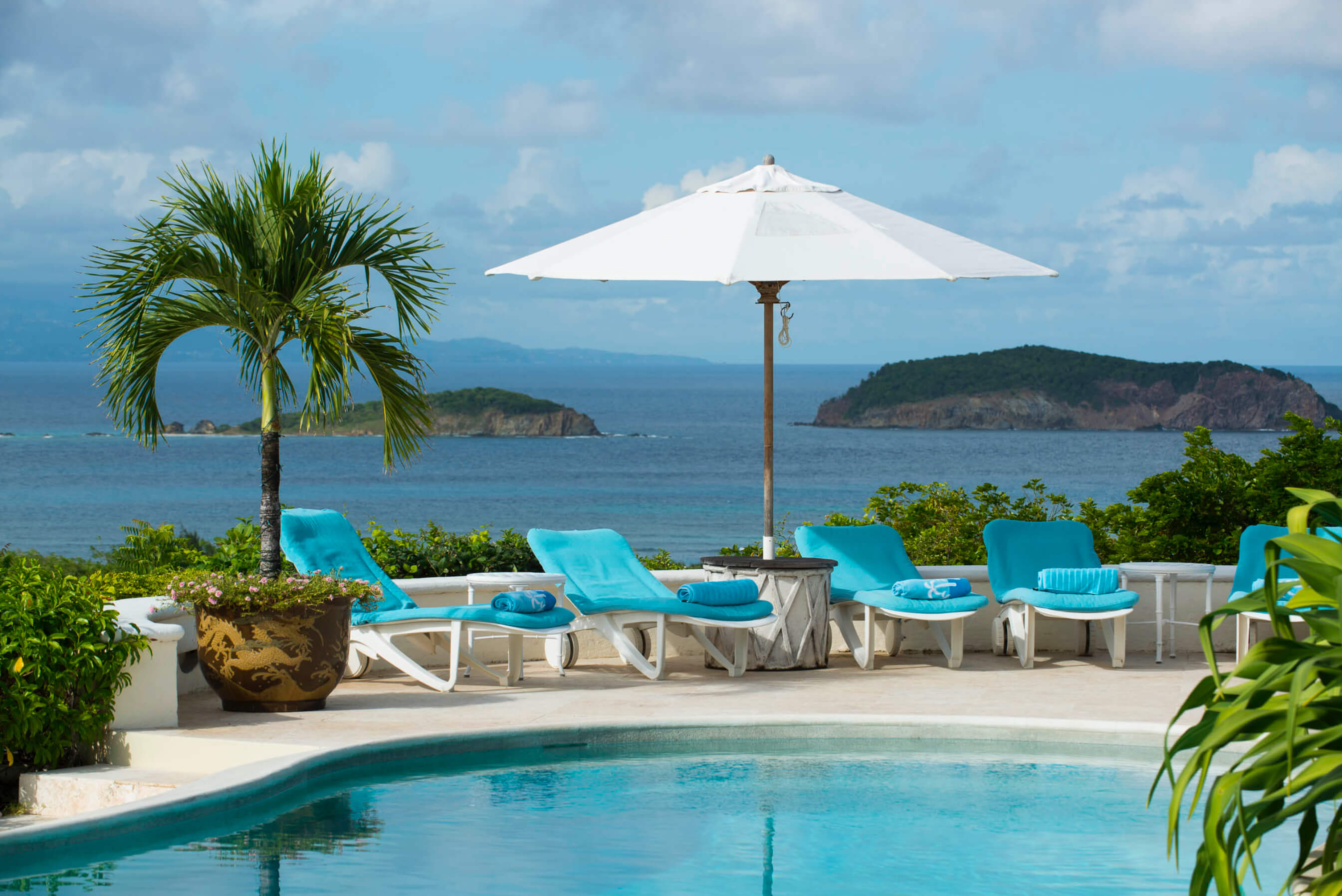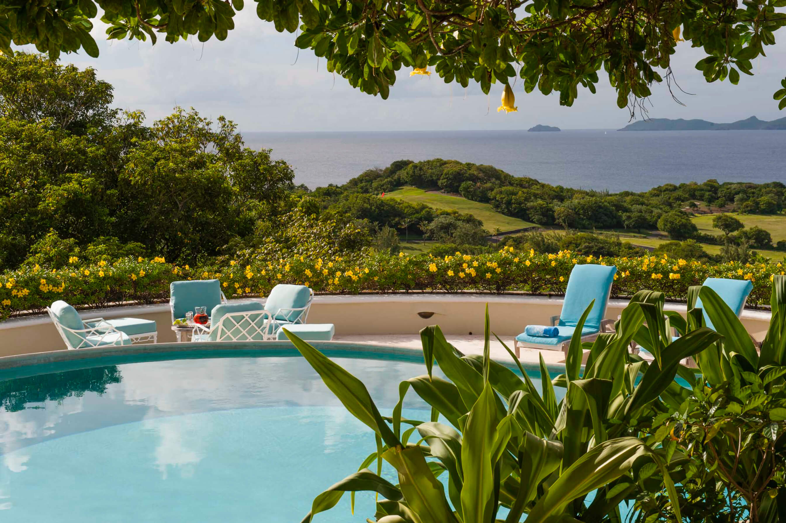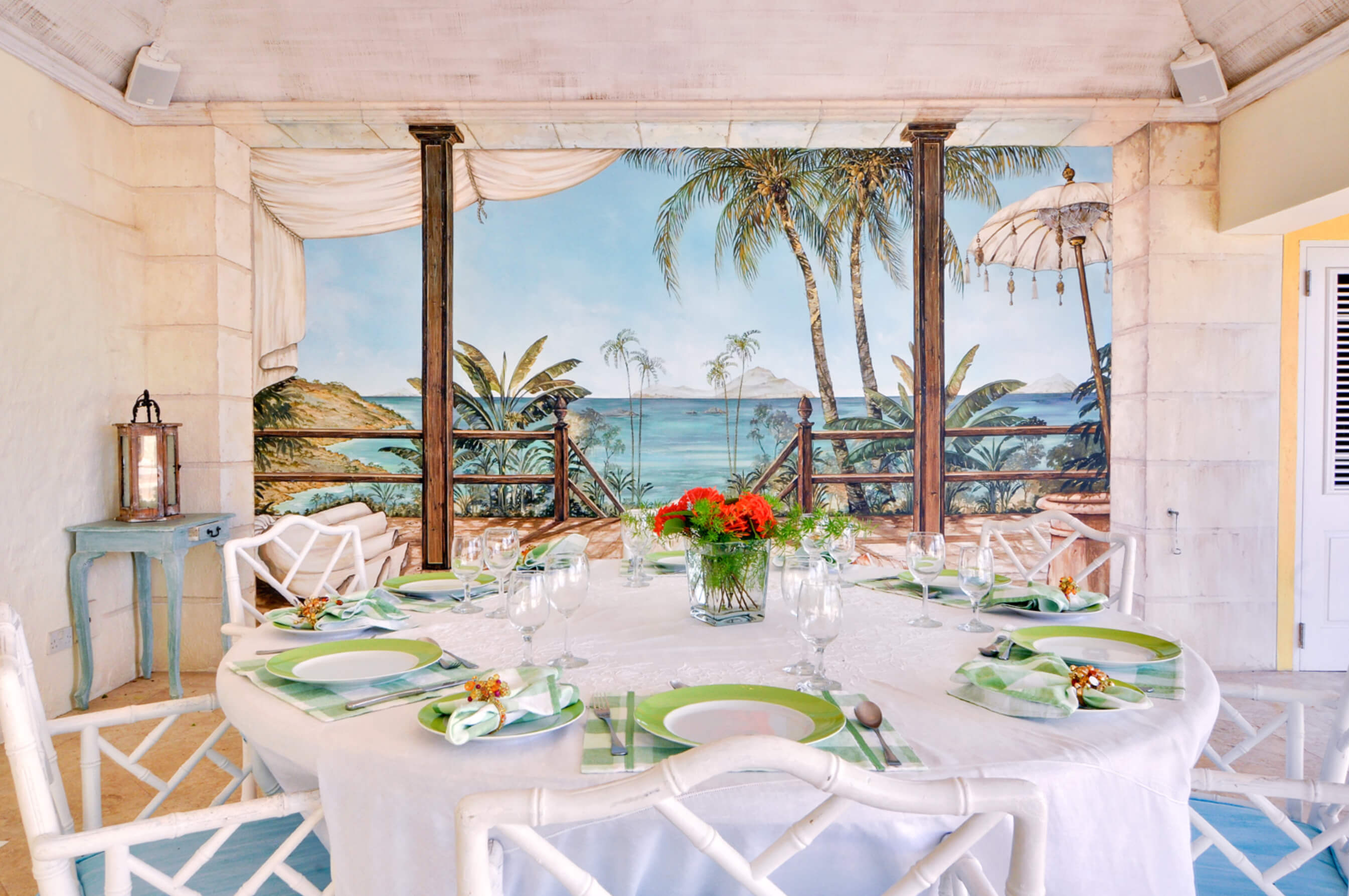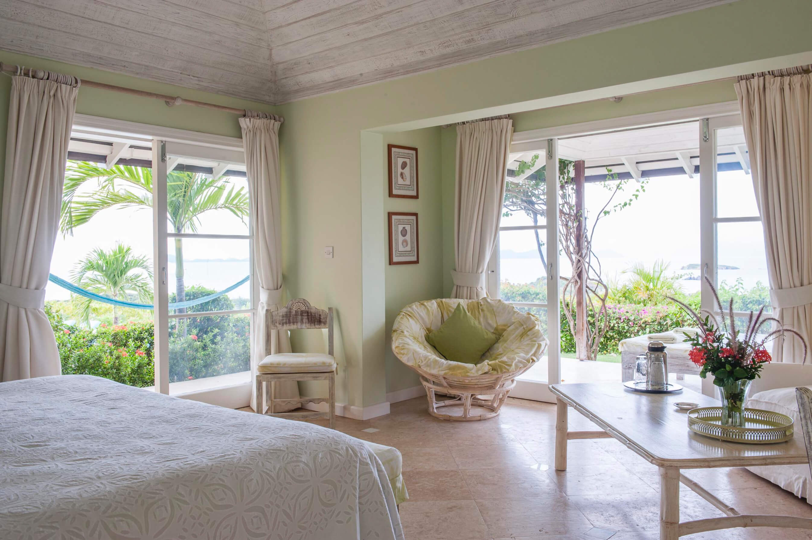 Renovated in 2010, the tasteful living and dining rooms are decorated in a chic Caribbean style with elegant English furnishings, connected to the villa's unique, pear-shaped swimming pool and surrounding sundeck.