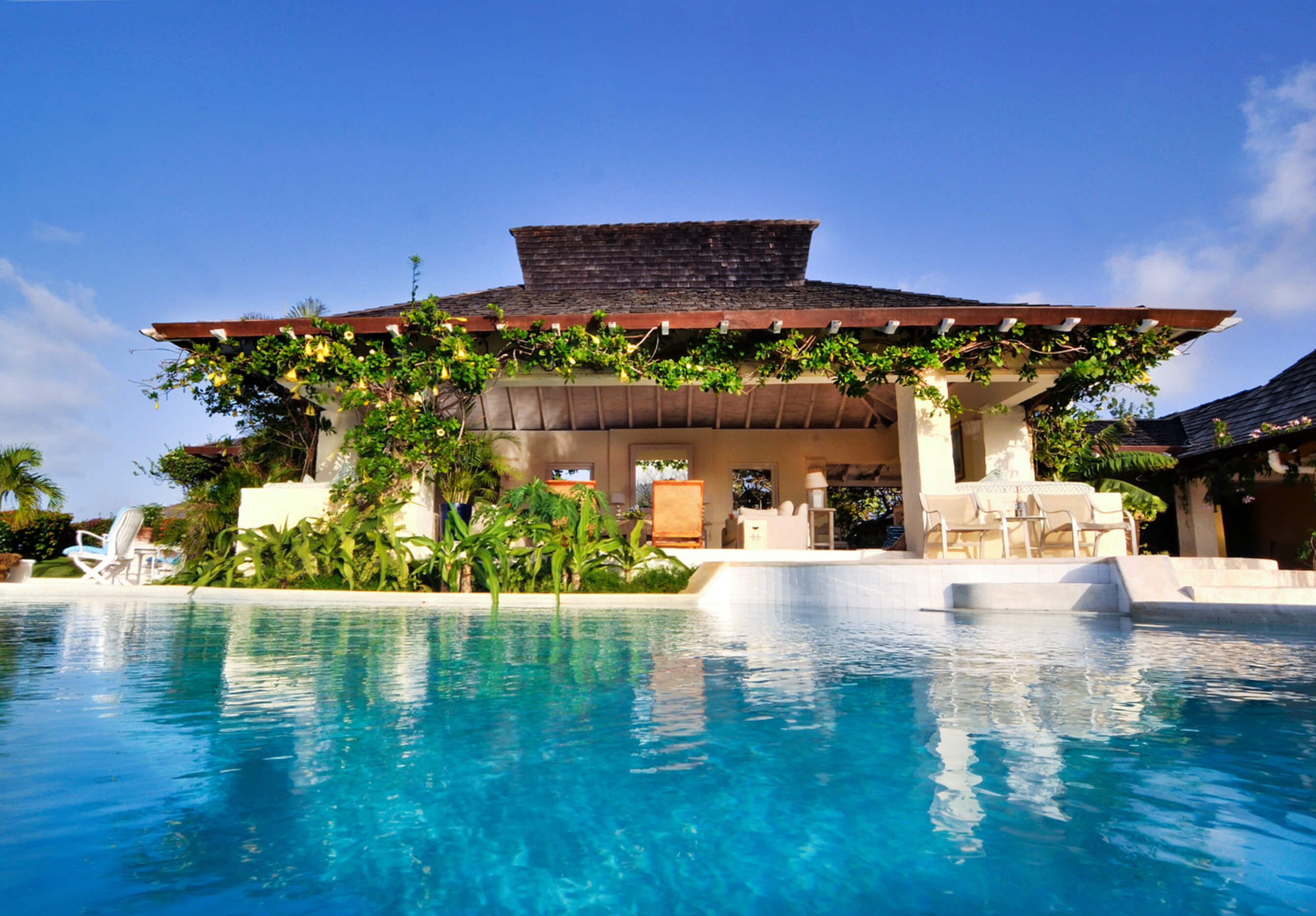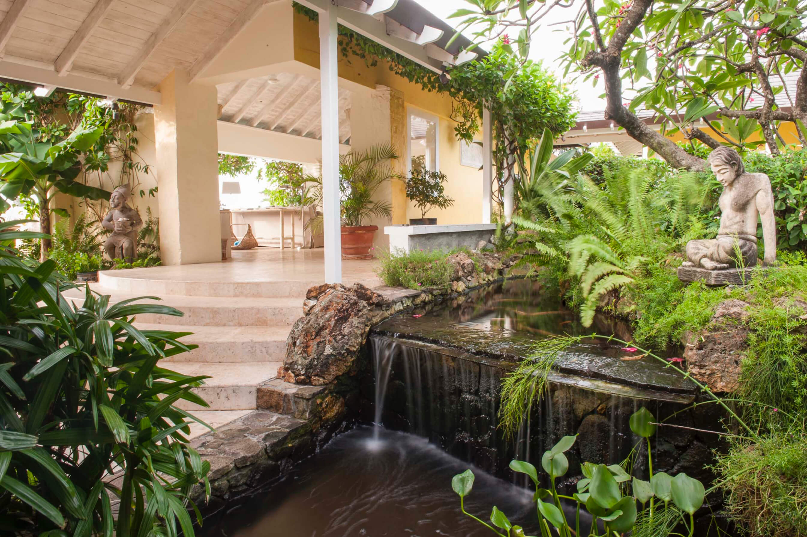 This charming quintessential Caribbean villa is designed around a lush central water garden with stream and waterfall.