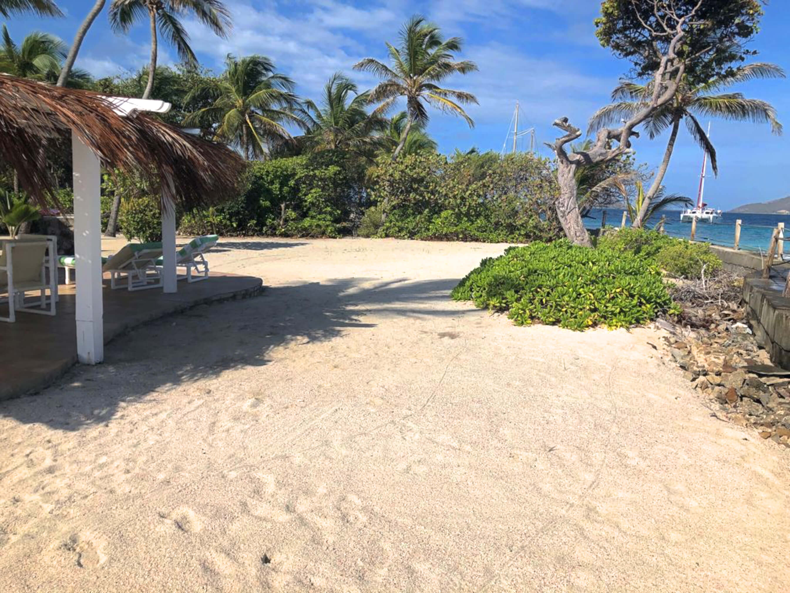 The terrace to the rear inland side of the house offers a quiet, cool, private space and can be accessed directly from the second bedroom. This area naturally leads out to the beautifully managed tropical sands of the Palm Island Resort.