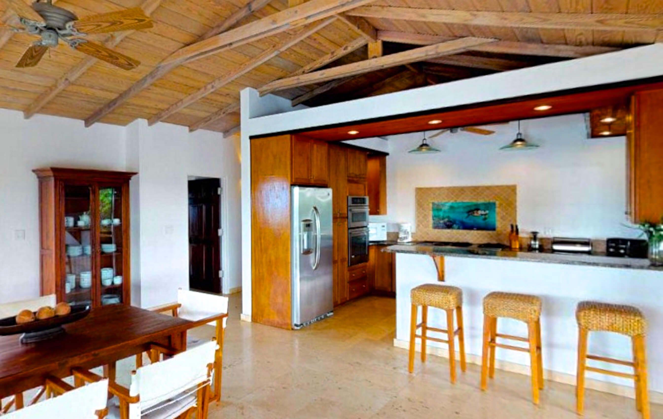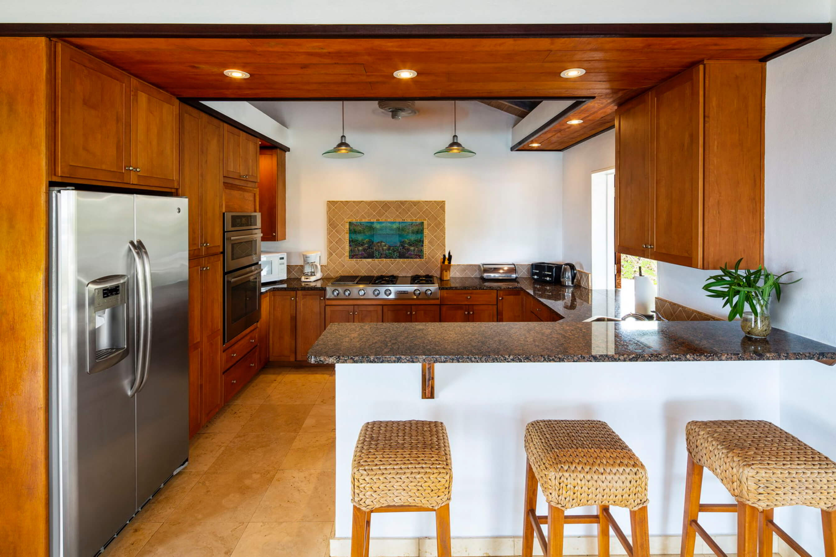 The villa kitchen is stocked with vacation essentials such as coffee, tea, snacks...
